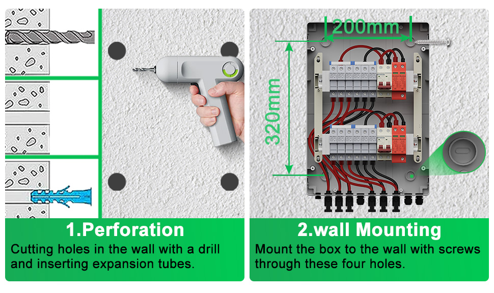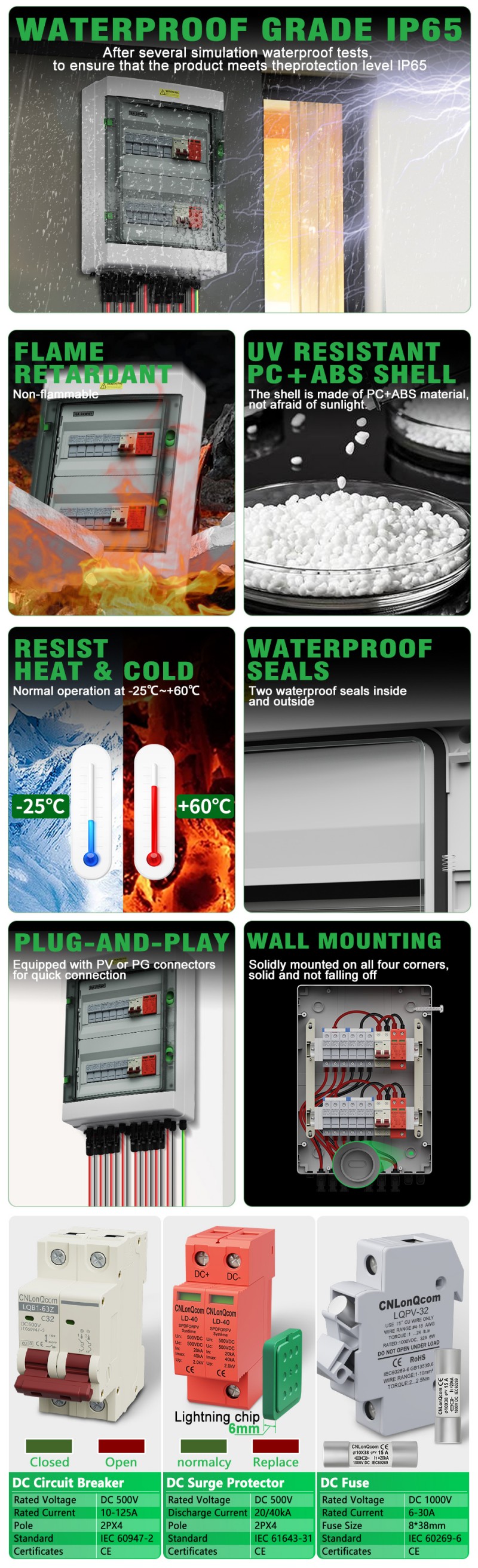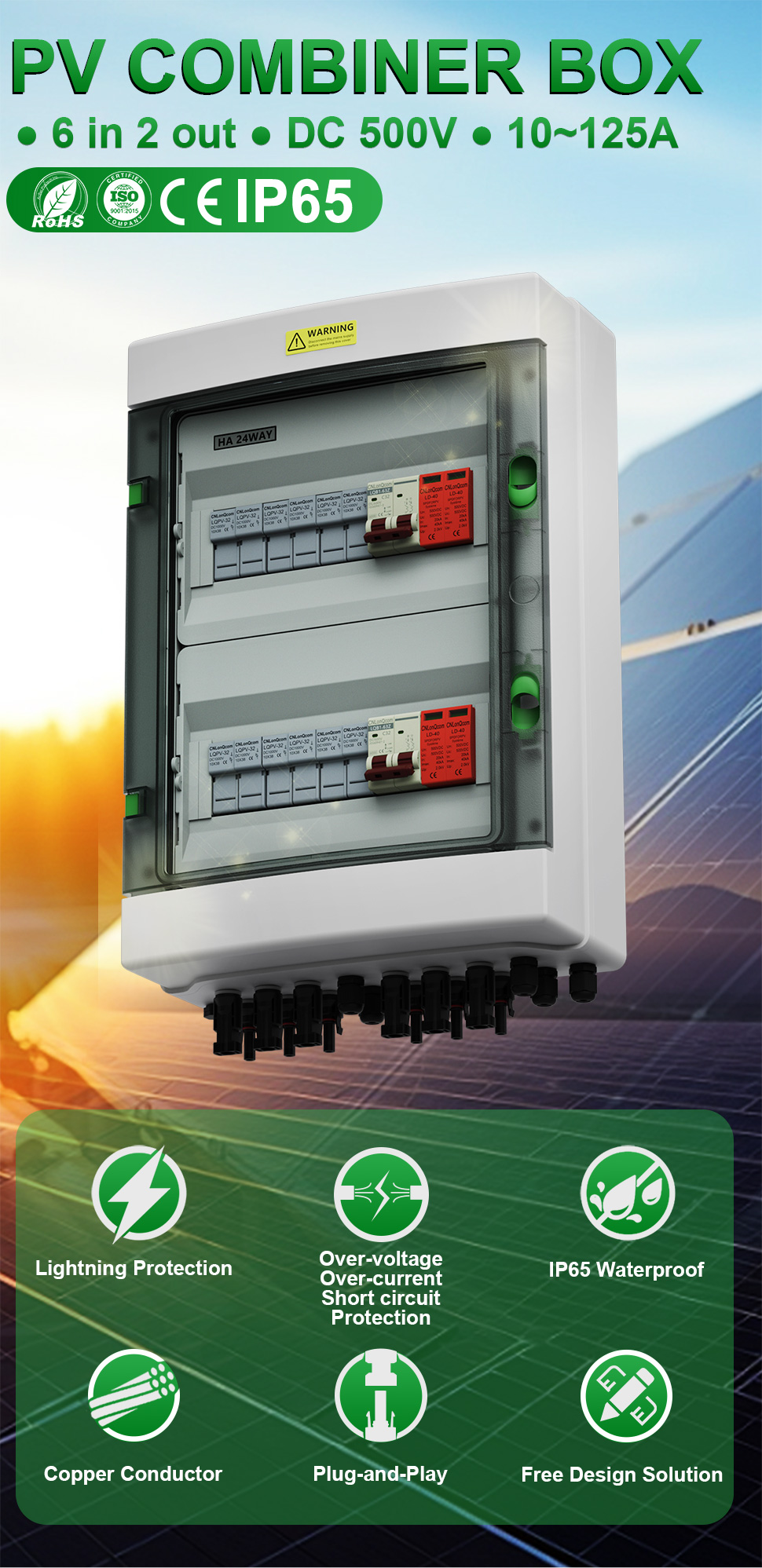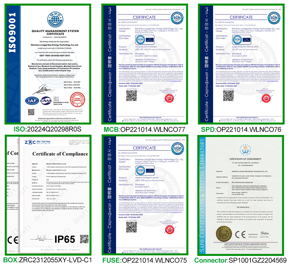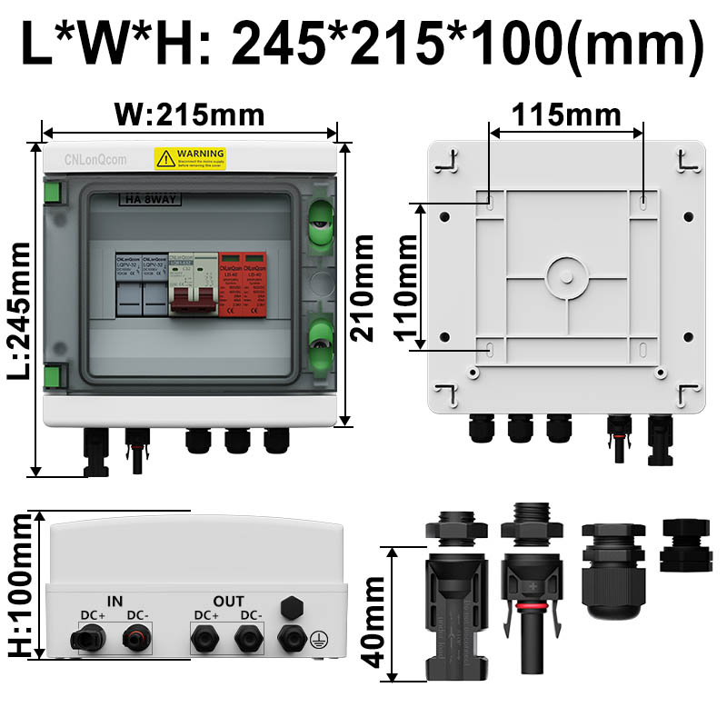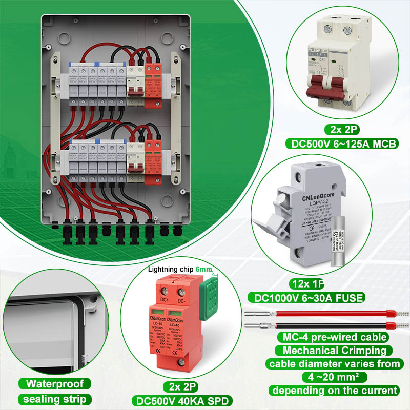 CNLONQCOM's HA-serie Plastic PV Combiny Box 6 in 2 uit DC500V/600V/800V worden voornamelijk gebruikt voor de bescherming van PV-systemen en worden vaak gebruikt in off-grid of raster-verbonden systemen. Zoals PV -panelen, RV, Boat, Outdoor PV, Huishouden, enz.